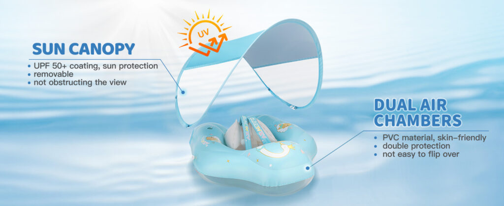 | Skin-friendly Material | ① The Baby floats are made of upgraded PVC material, safe and environment- friendly, soft and odourless, designed for infants and toddlers. ② Added sun canopy, covered with UPF 50+ sun protection coating to protect baby's skin from UV rays. |