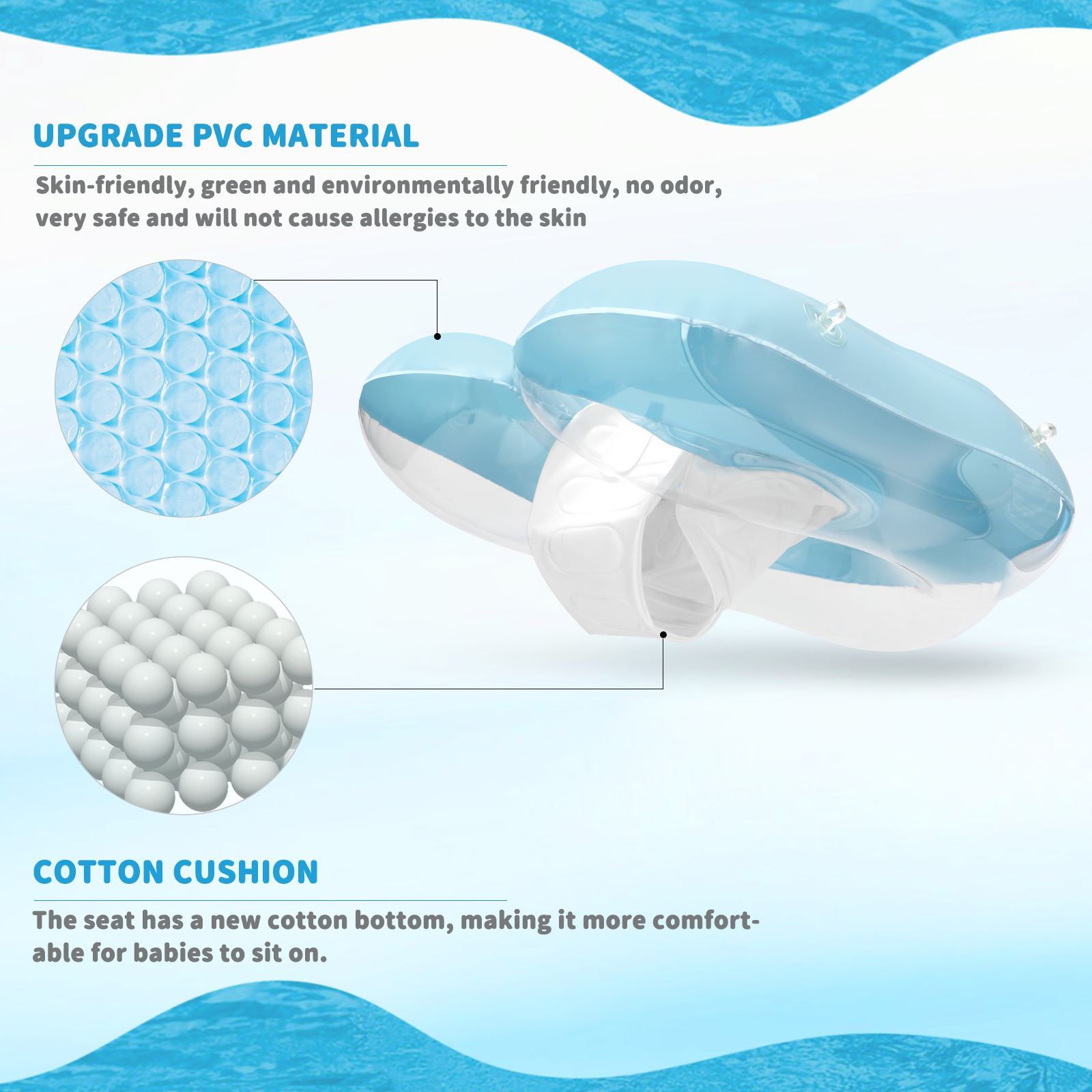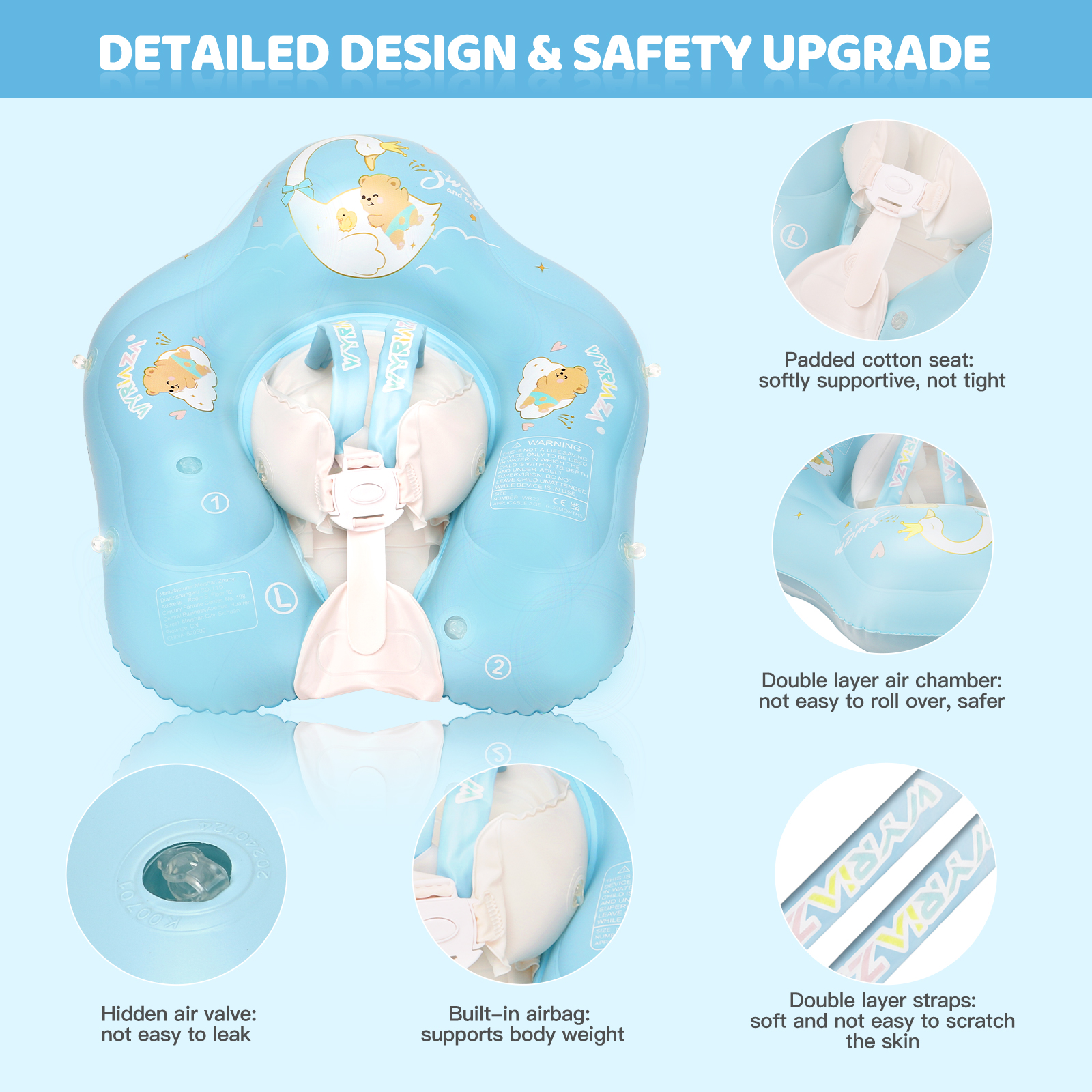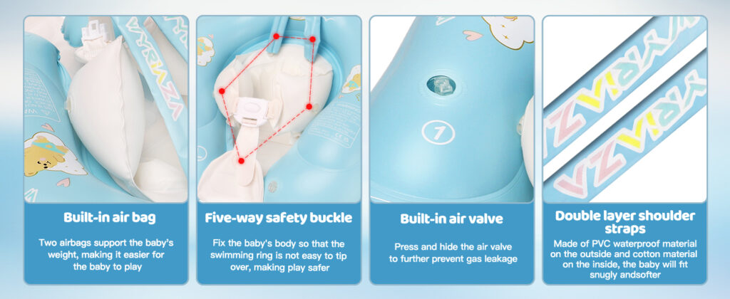 | Safety Design | ① Designed with a double-layer air chamber, heightened and widened all around to prevent the baby from leaning forward, tipping over or slipping out. ② Two PVC adjustable straps fix the baby's position, and a new outer layer is added to prevent scratching the skin. ③ There are two small air bags on the belly of the swimming ring to support the baby, making it easier to play. ④ The swimming ring seat is added with a cotton sandwich to make it more comfortable for children to use. |