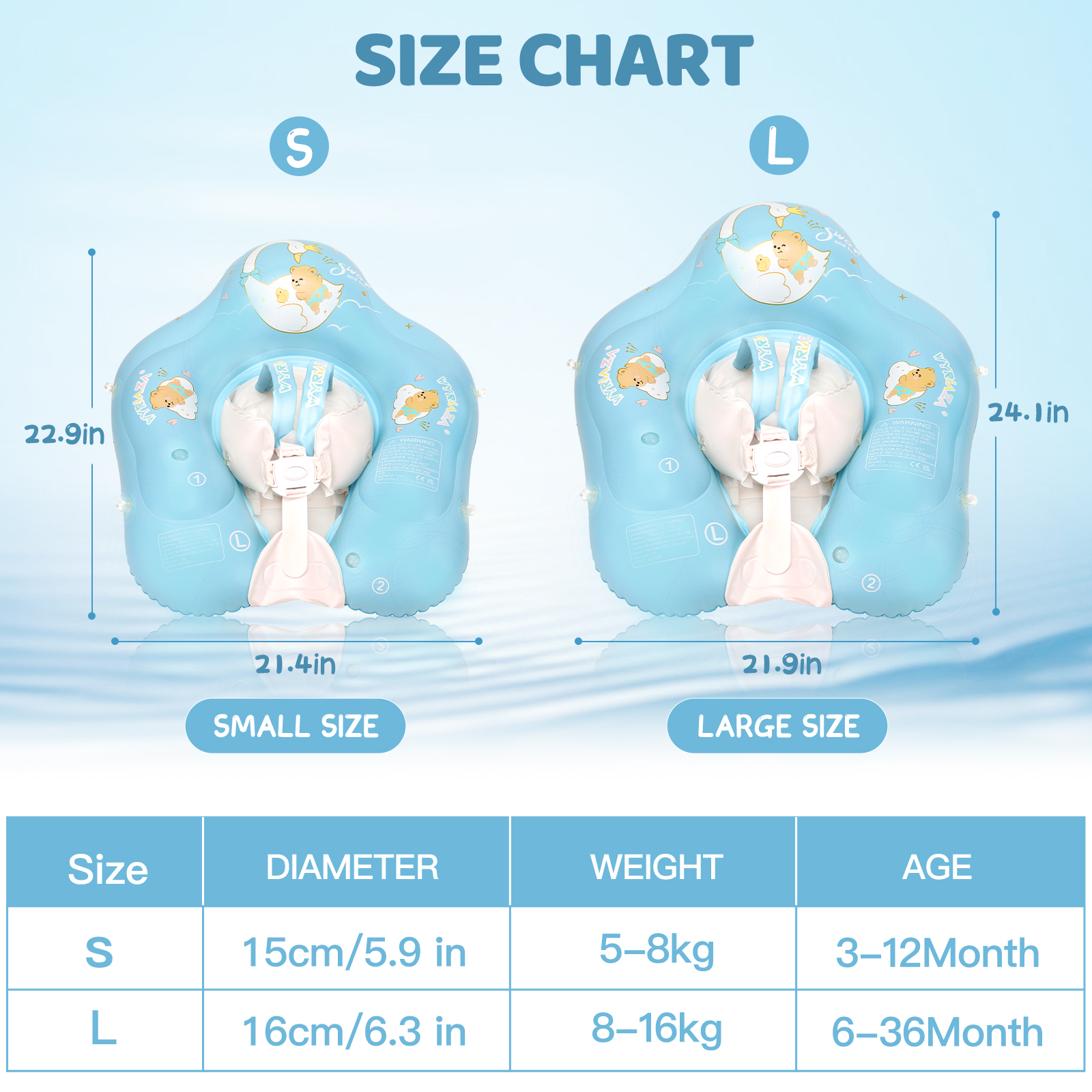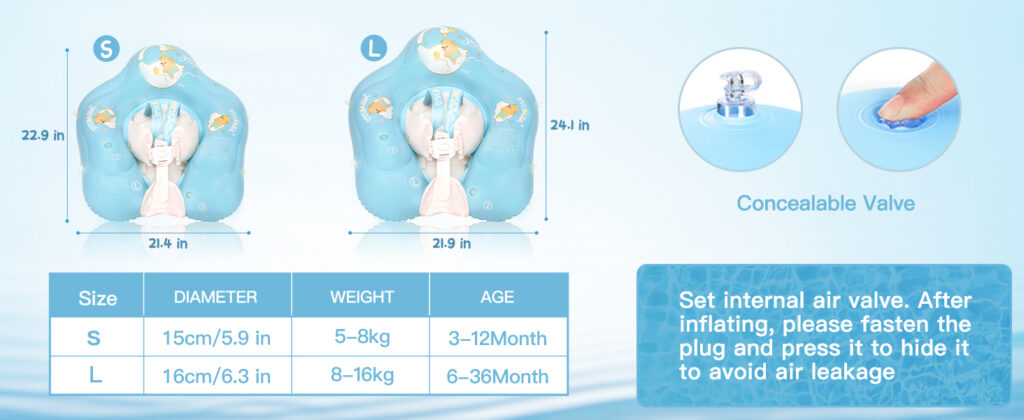 | Size Selection | Suitable for babies aged 3-36 months(1-3 year old), weighing 10-35 LB.When using, it is recommended to inflate the infant pool float to 70-80% for more comfortable use. |