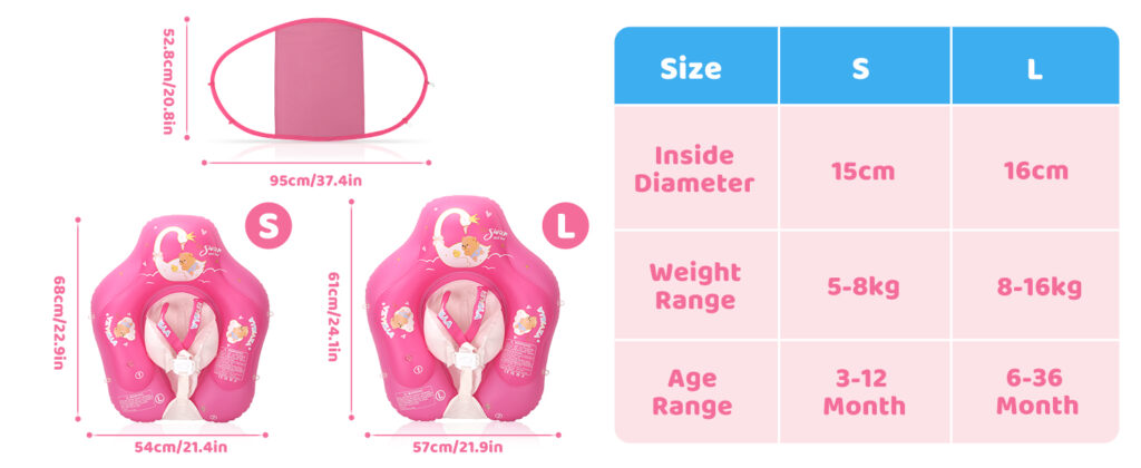 | Size Selection | Suitable for babies aged 3-36 months(1-3 year old), weighing 10-35 LB.When using, it is recommended to inflate the infant pool float to 70-80% for more comfortable use. |